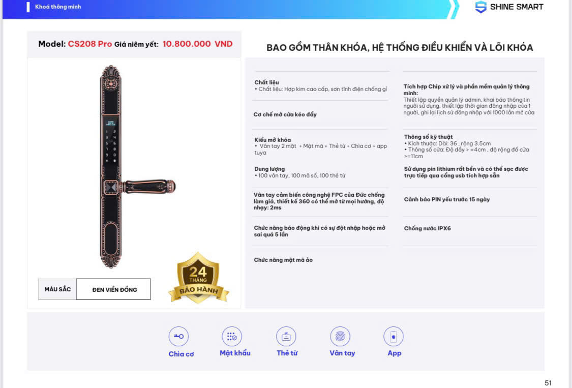 Khóa cửa vân tay Shine Smart CS 208 PRO là dòng máy kiểm soát có giá thành tốt nhất hiện nay, người dùng có thể mở khóa bằng vân tay, thẻ từ, mã số và Mobile App vô cùng tiện lợi. Máy có dung lượng quản lý lên đến 100 dấu vân tay và 100 thẻ, bạn có thể dùng pin (4 viên pin AA) hoặc nguồn điện 12V để hoạt động. Sau đây là những đặc điểm nổi bật của dòng khóa này!